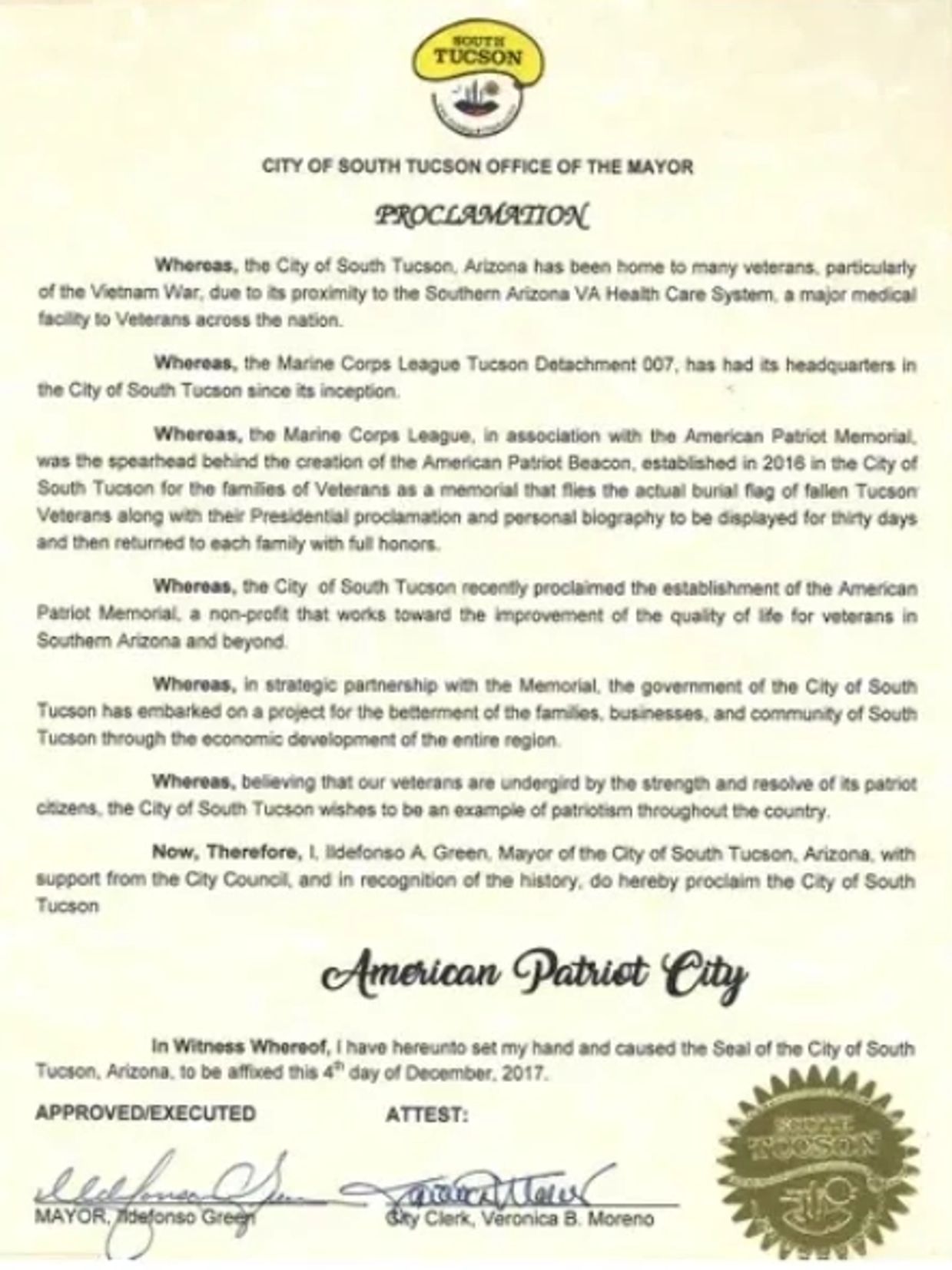 The City of South Tucson was deemed the American Patriot City in December 2017.